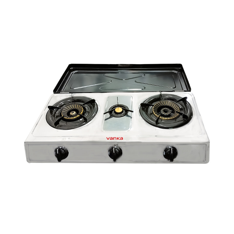 This portable 3 burner stainless steel gas stove features a sturdy tabletop design with integrated cover suitable for kitchen cooking and outdoor use Durable stainless steel body ensures long lifespan and easy cleaning High efficiency burners deliver fast even heat ideal for families restaurants and catering Adjustable flame control offers precise cooking experience Windproof cover design enhances safety and flame stability making it perfect for various cooking environments.